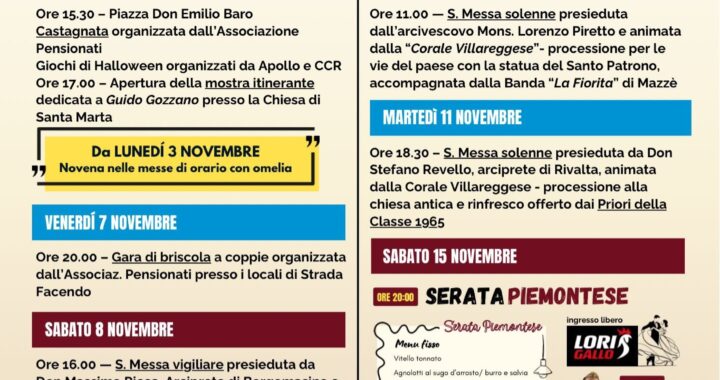 Torna Dal 2 al 16 novembre 2025, l’appuntamento più atteso dell’anno a Villareggia con un programma ricco di eventi, celebrazioni e momenti di comunità!